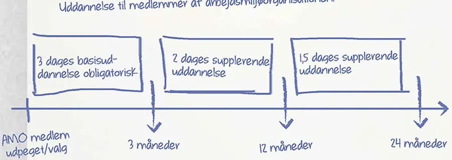 Nye medlemmer af AMO skal gennemgå en obligatorisk arbejdsmiljøuddannelse, der varer tre dage, med mindre de allerede har gennemført den. Arbejdsmiljøuddannelsen skal være gennemført senest tre måneder efter at arbejdsmiljørepræsentanten er valgt/ arbejdslederen udpeget.